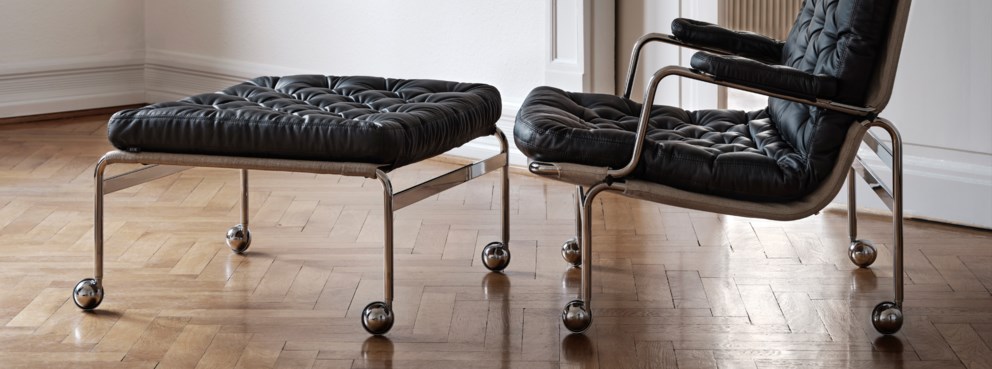 Karin 73 以其首次發佈年份命名,是 Bruno Mathsson 設計原版 Karin 扶手椅的首款進化版。這款優雅的凳子是該系列不可或缺的單品,填充靠墊可置於鍍鉻框架和支撐網上,提升舒適度。